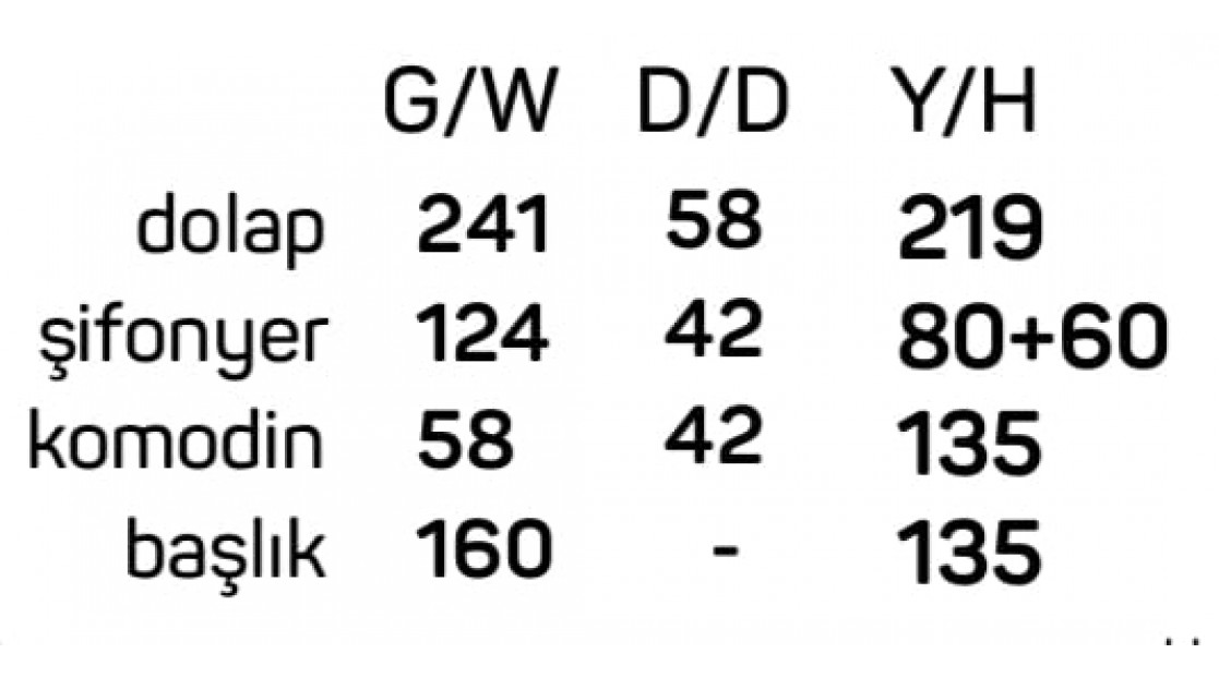 * Dolap, Şifonyer, 2 Komodin, Karyola Başlığı şeklindedir.